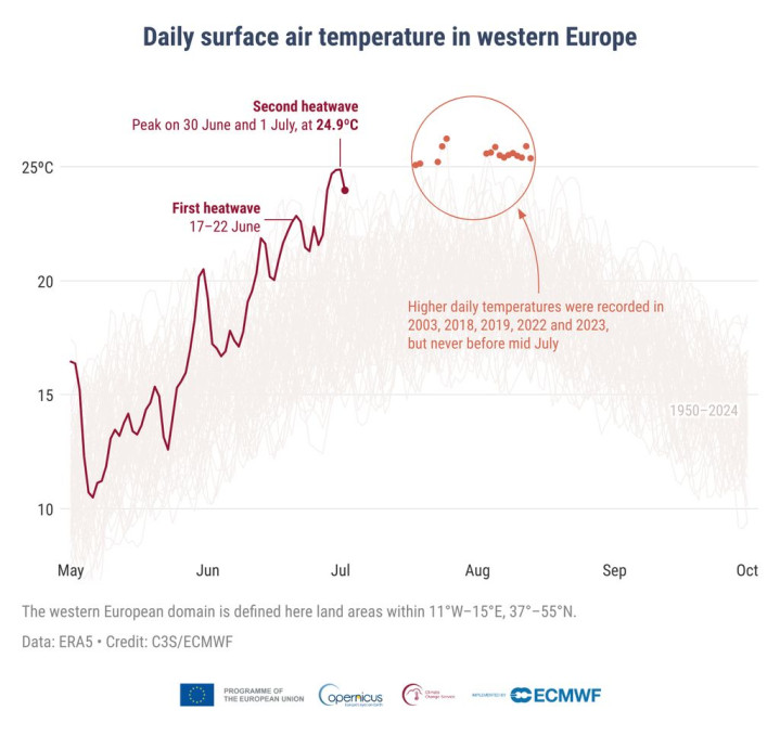 该机构也确认,2025年6月中旬和6月下旬至7月初,欧洲大陆经历了两次显著的热浪,西欧整体经历了有记录以来最热的6月。