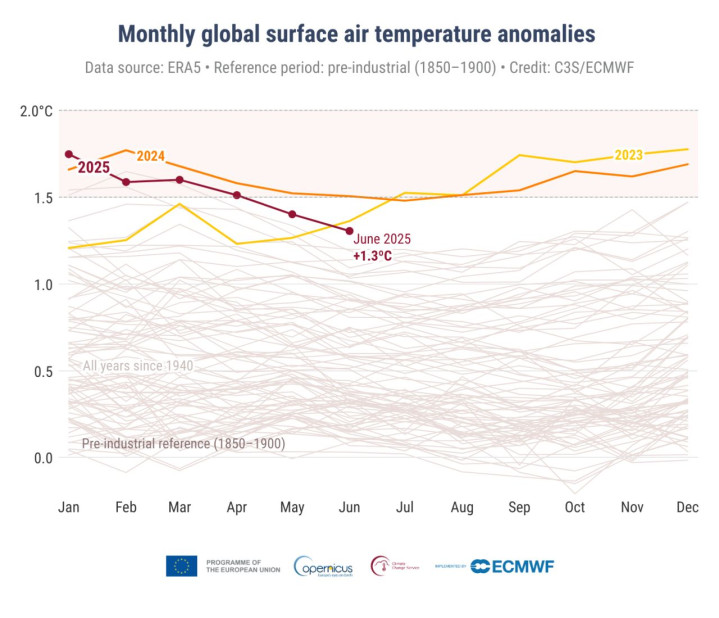 报告显示,2025年6月全球平均地表气温为16.46摄氏度,仅比2024年6月和2023年6月分别低0.2摄氏度和0.06摄氏度,但较工业化前(1850年至1900年)水平高出1.3摄氏度。IT之家附上相关图片如下: